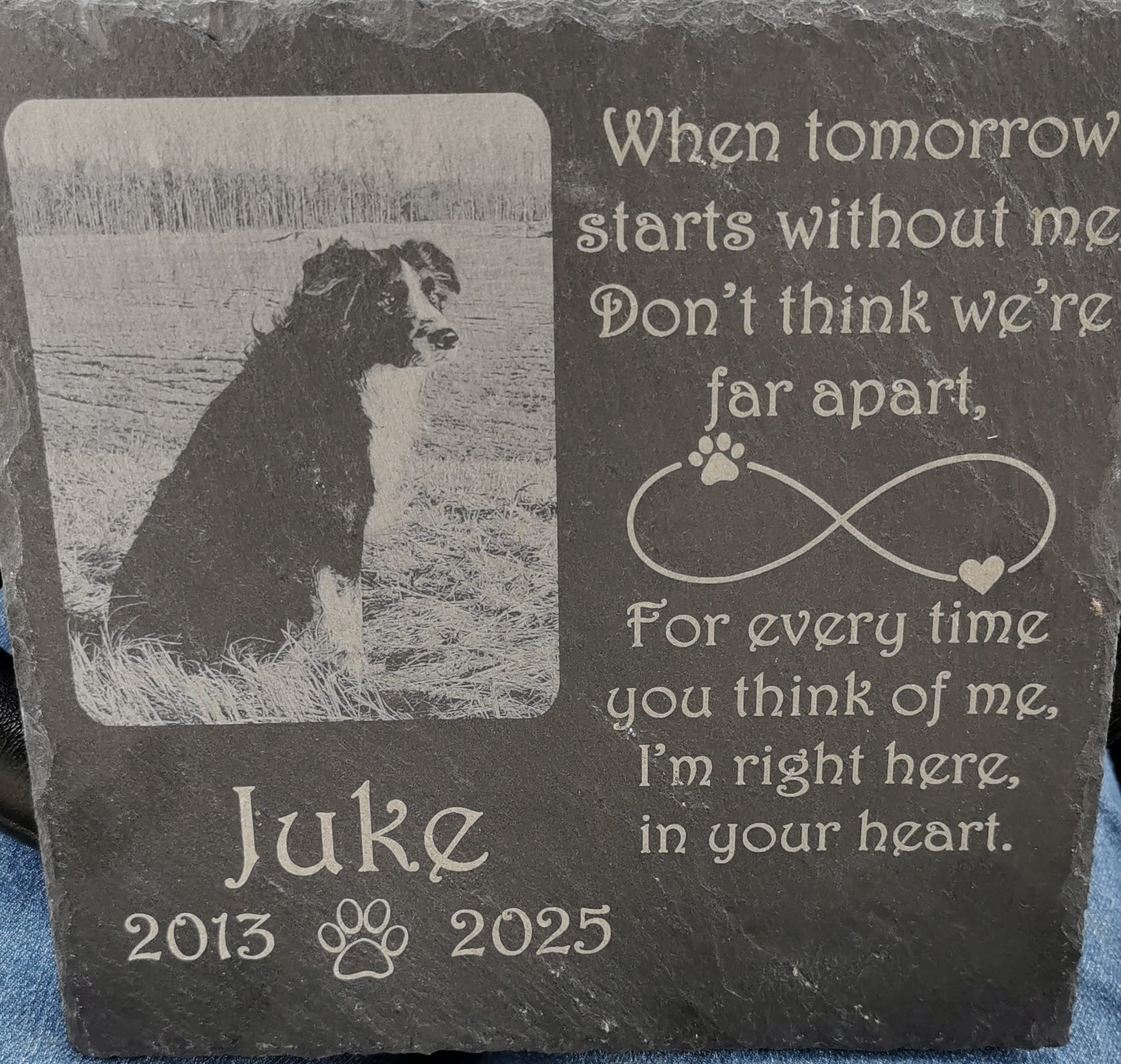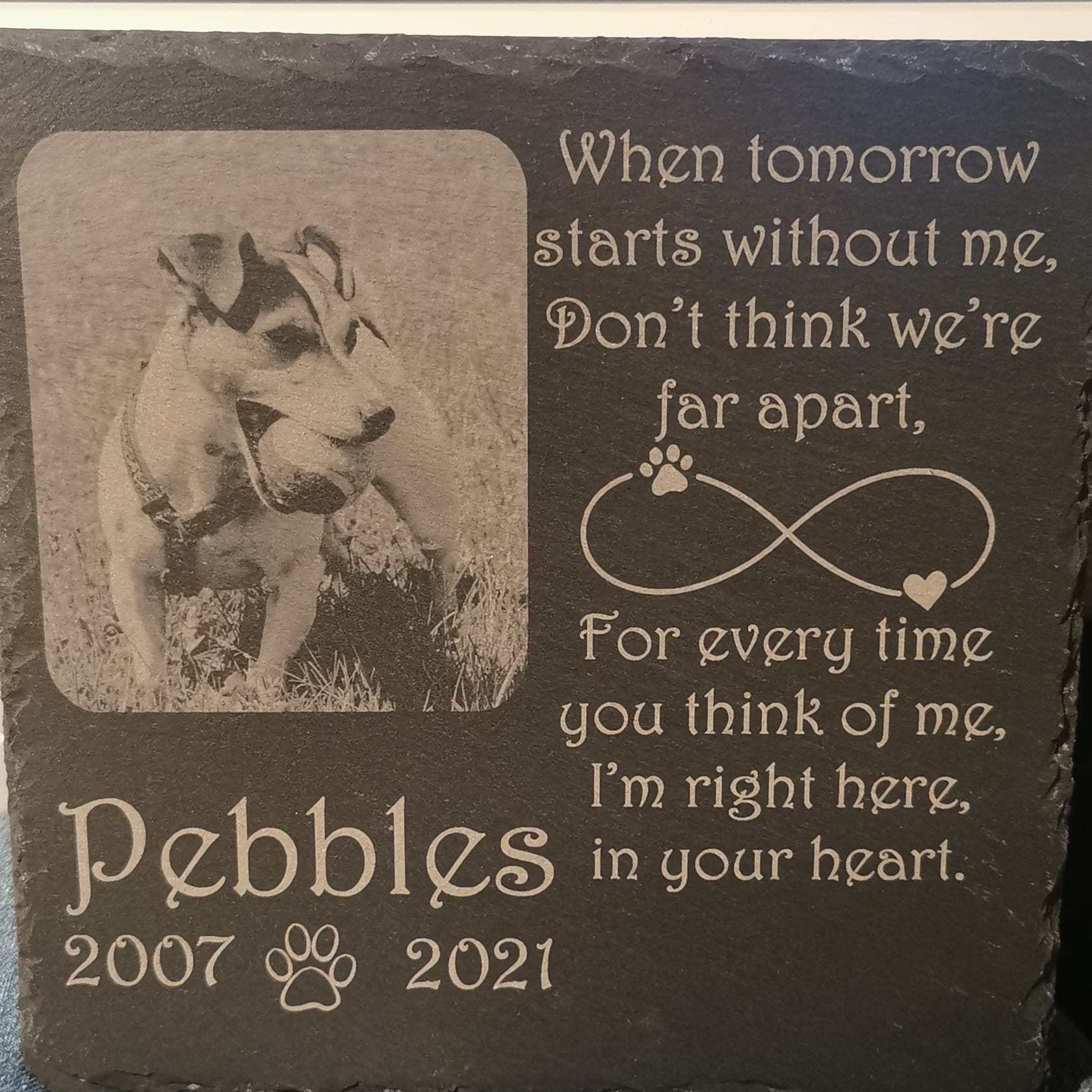 “Een liefdevolle, handgemaakte leisteen display om jouw overleden huisdier te eren. Personaliseer met foto, naam en datums voor een blijvende, warme herinnering.”